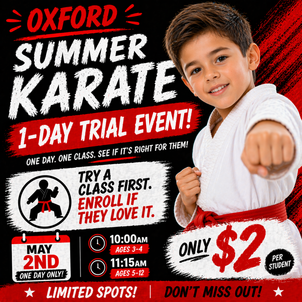 On May 2nd, we’re hosting a 1-Day Karate Trial Event where your child can try a real class, meet our instructors, and experience the dojo—no pressure.