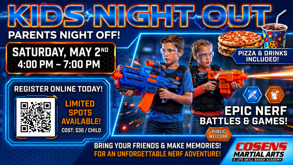 Drop the kids off for an unforgettable Kids Night Out at Cosens Martial Arts! 💥 From epic Nerf battles 🔫 to high-energy games 🎮, it’s nonstop fun from the moment they arrive.